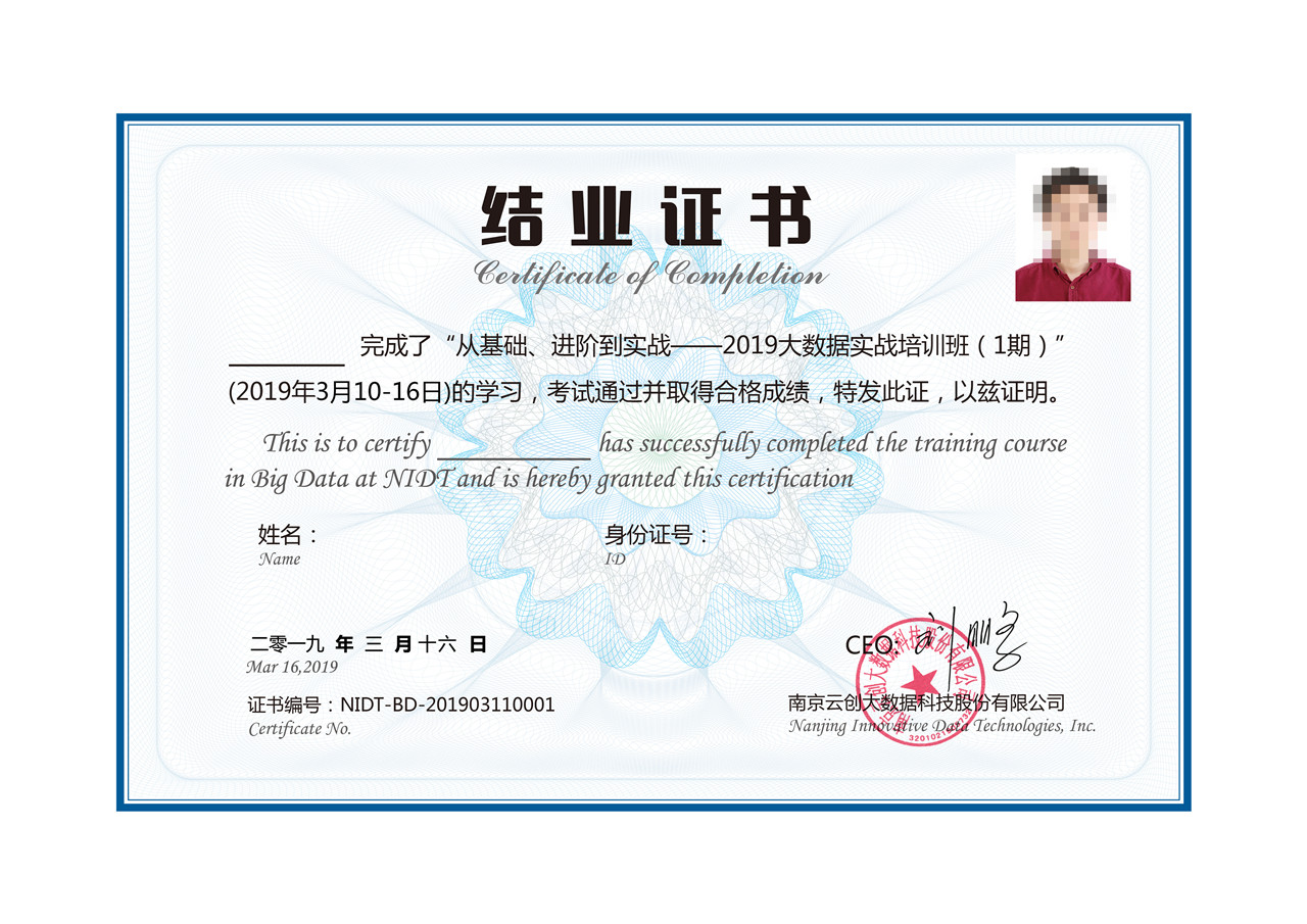 【可選】由知名的Silicon Stone Education(SSE,硅石教育集團(tuán))頒發(fā)的國際大數(shù)據(jù)人才認(rèn)證證書(需要通過在線考試,學(xué)員可在報(bào)到時(shí)選擇是否進(jìn)行證書考試報(bào)名,報(bào)名的學(xué)員將按照900元/人繳納證書工本費(fèi),并在考試合格后獲得證書)。