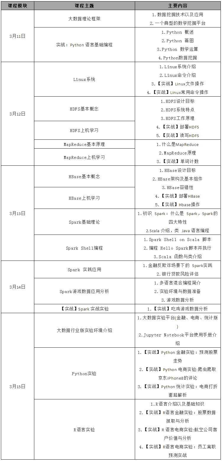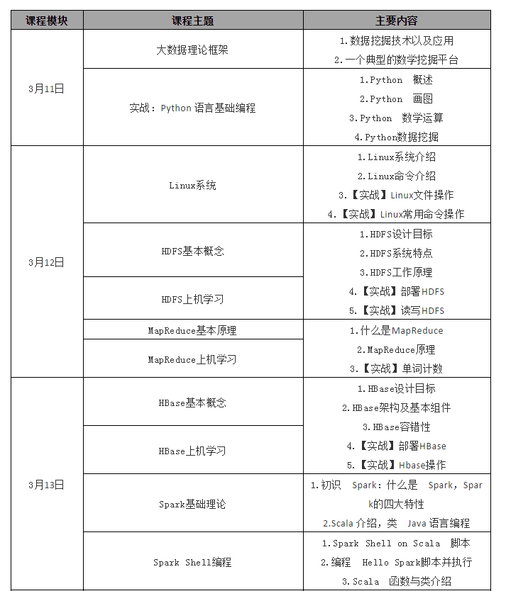 課堂沒有冗長乏味的理論講授,而是通過密集的高強(qiáng)度實(shí)戰(zhàn)課程,帶領(lǐng)學(xué)員克服大數(shù)據(jù)能力提升中各階段的典型痛點(diǎn)和難點(diǎn):幫助每位參訓(xùn)學(xué)員跑通每一項(xiàng)實(shí)驗(yàn),讓學(xué)員能學(xué)到真本事;幫助院校教師開拓課程開設(shè)思路;幫助學(xué)生解決畢業(yè)就業(yè)面臨的實(shí)戰(zhàn)能力問題;幫助科研人員打磨科研方向等。您不需基礎(chǔ),就可以直接動(dòng)手實(shí)驗(yàn),更重要的是,通過參加本次培訓(xùn),再加以自學(xué),可實(shí)現(xiàn)學(xué)員在理論和實(shí)踐、培訓(xùn)和自學(xué)之間的輕松轉(zhuǎn)換。具體培訓(xùn)大綱如下: