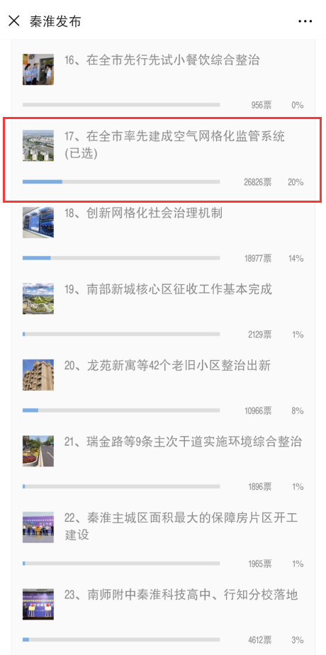 在評(píng)選過(guò)程中,秦淮區(qū)宣傳部廣泛調(diào)動(dòng)全區(qū)廣大干部群眾積極參與投票評(píng)選。連續(xù)7天的投票評(píng)選,30條候選條目累計(jì)獲得投票13萬(wàn)多張。其中,在投票過(guò)程中,秦淮區(qū)空氣質(zhì)量網(wǎng)格化監(jiān)管系統(tǒng)始終獲得參選干部群眾的青睞。