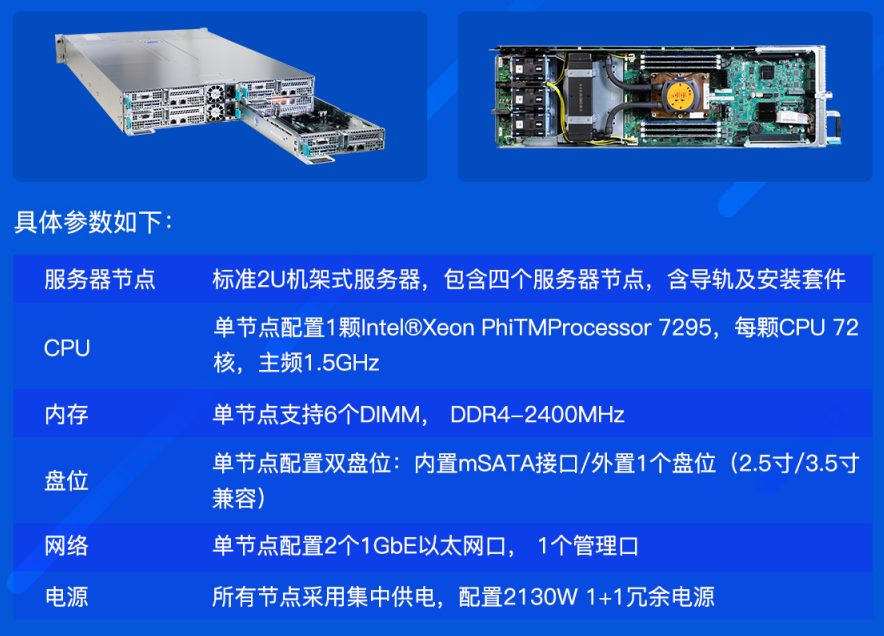 四子星服務(wù)器是基于Intel處理器開發(fā)的標(biāo)準(zhǔn)2U機(jī)架式服務(wù)器,配置4顆英特爾®至強(qiáng)融核™處理器,每個(gè)CPU內(nèi)核多達(dá)72個(gè),能夠提供穩(wěn)定、安全的計(jì)算力保證,具體參數(shù)如下: